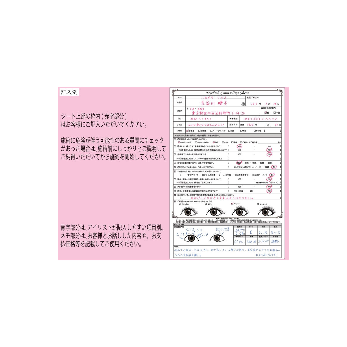 Counseling sheet for eyelash extension salons.