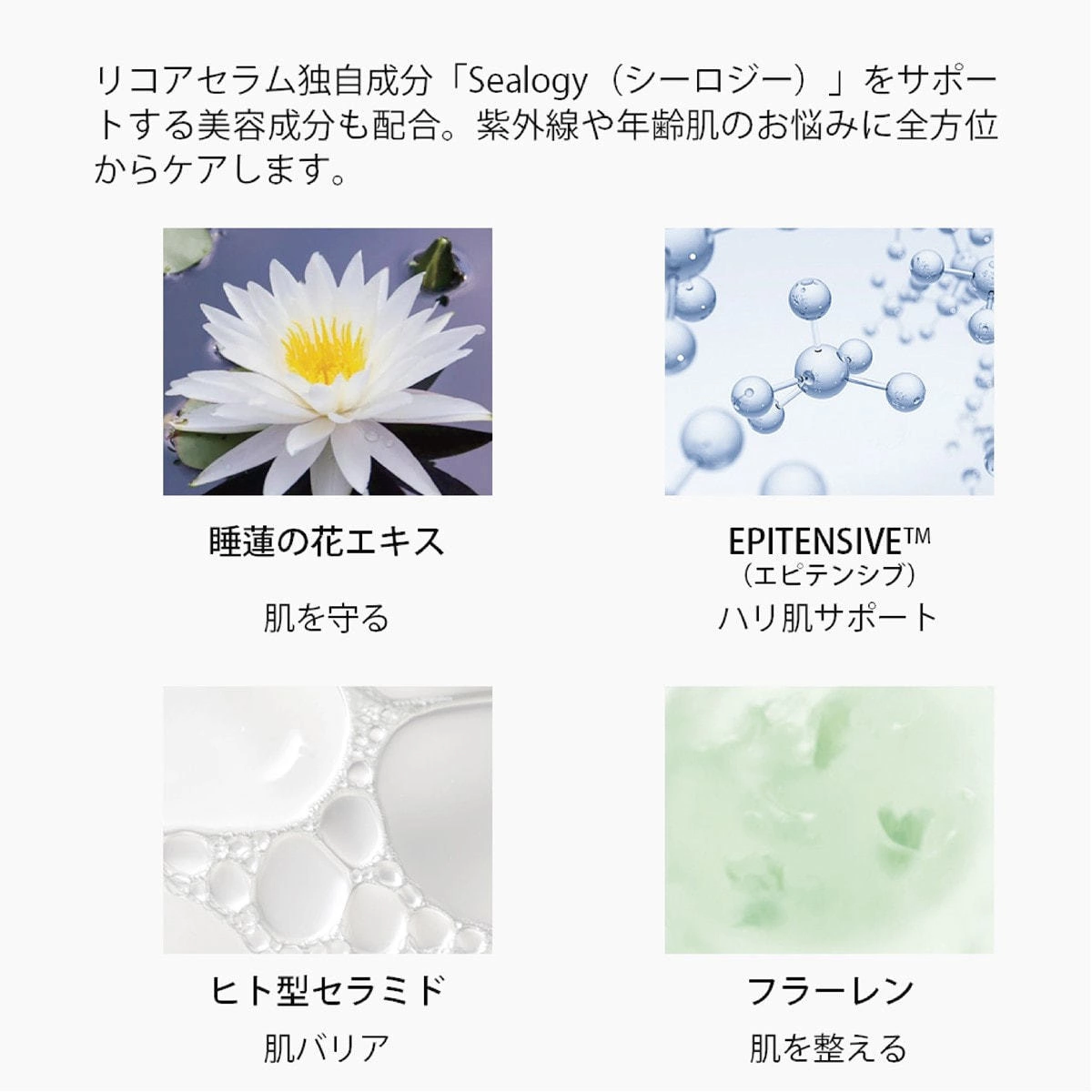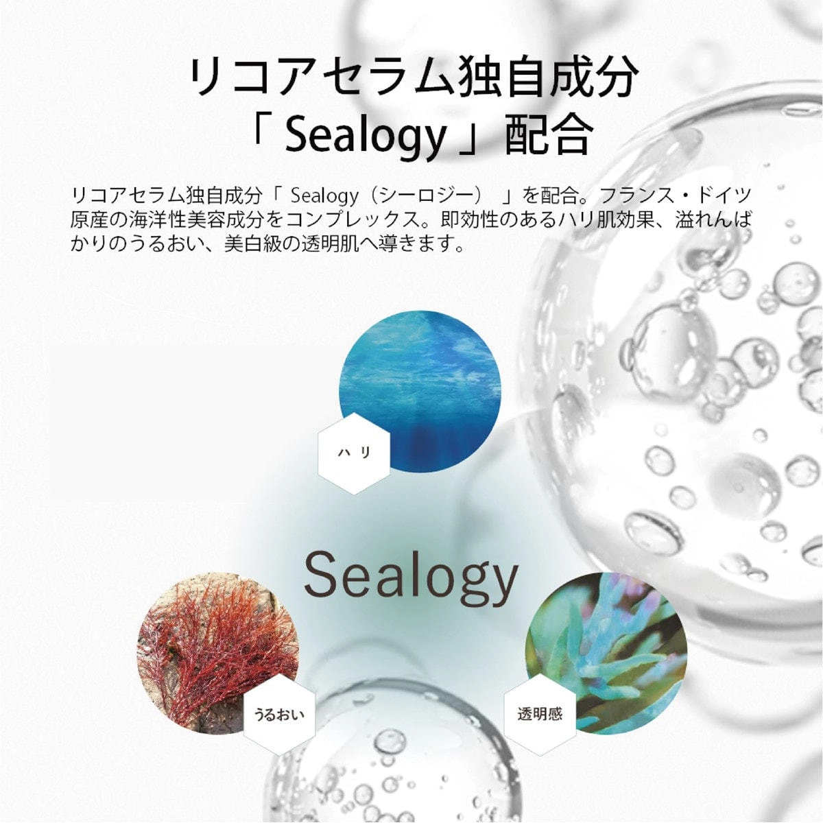Water, propanediol, BG, glycerin, DPG, Alteromonas fermented extract, hydrolyzed red algae extract, cystoseylata marisifolia extract, oligopeptide-1, apple fruit culture cell extract, Bacillus fermented product, white jellyfish polysaccharide, rosemary leaf Extract, squalane, fullerene, glycyrrhizinic acid 2K, ceramide NP, ceramide NG, ceramide AP, water-soluble proteoglycan, sodium hyaluronate, hydrolyzed hyaluronic acid, acetylhyaluronic acid Na, nymphae alba flower extract, water-soluble collagen, succinoyl atelocollagen , Hydrolyzed collagen, PEG-75, glyceres-26, seawater, palmitoyl proline Na, phytosterols, pentylene glycol, ethylhexyl glycerin, PEG-60 hydrogenated castor oil, lecithin, hydrogenated lecithin, tri (caprylic acid / capric acid) ) Glyceryl, octyldodecanol, xanthan gum, citric acid, Na citrate, 2Na phosphate, K phosphate, phenoxyethanol