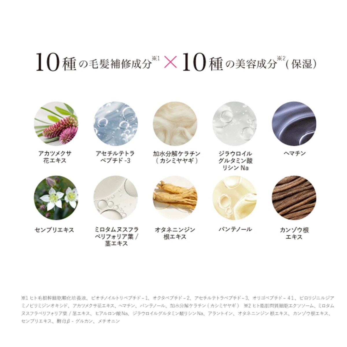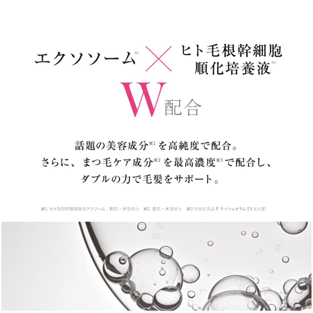Water, BG, Glycerin, Hydrogenated Starch Hydrolysate, Propanediol, Human Hair Root Stem Cell Conditioned Medium, Human Adipose Stromal Cell Exosomes, Biotinoyl Tripeptide-1, Octapeptide-2, Acetyl Tetrapeptide-3, Oligopeptide-41, Pyrrolidinyl Diaminopyrimidine Oxide, Red Clover Flower Extract, Myrothamnus Flabellifolia Leaf/Stem Extract, Hematin, Sodium Hyaluronate, Panthenol, Hydrolyzed Keratin (Cashmere Goat), Sodium Dilauramidoglutamide Lysine, Allantoin, Panax Ginseng Root Extract, Licorice Root Extract, Swertia Japonica Extract, Yeast β-Glucan, Methionine, Bisethoxydiglycol Cyclohexane-1,4-Dicarboxylate, Sodium Polyacryloyldimethyltaurate, Dextran, 1,2-Hexanediol, t-Butanol, Phytic Acid, Pentasodium Pentetate, Pentylene Glycol, Phenoxyethanol, Silver Oxide