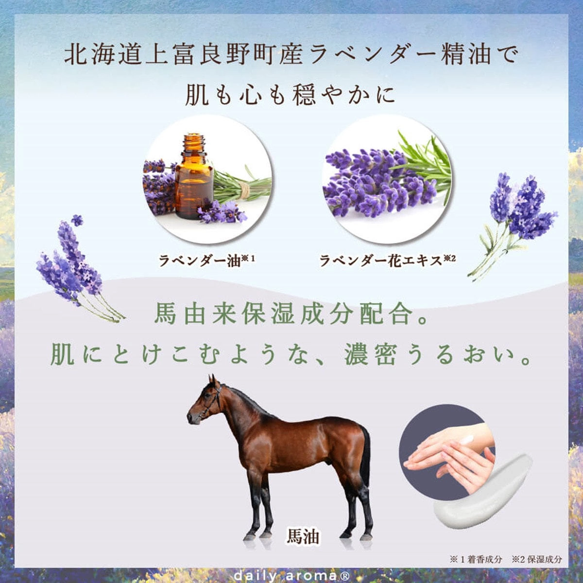 Water, castor oil, glycerin, shea butter, cetanol, hydroxyethyl acrylate/sodium acryloyldimethyl taurate copolymer, lavender oil, lavender flower extract, horse oil, olive fruit oil, propanediol, glyceryl stearate SE, diisostearyl malate, sorbitan isostearate, polysorbate 60, stearic acid, xanthan gum, gum arabic, iodopropynyl butylcarbamate, butylene glycol